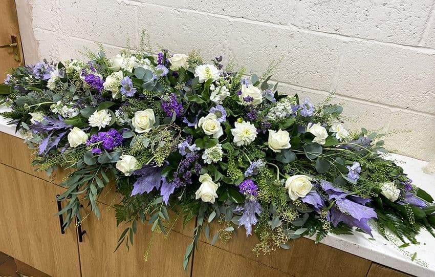 A lovely coffin spray comprising a lovely mixture of flowers with foliage The spray is available in different lengths, 1m, 1.5m or 2metres long.