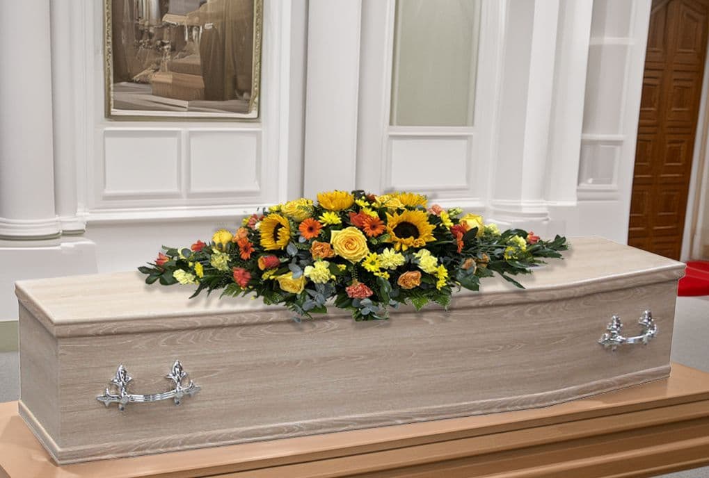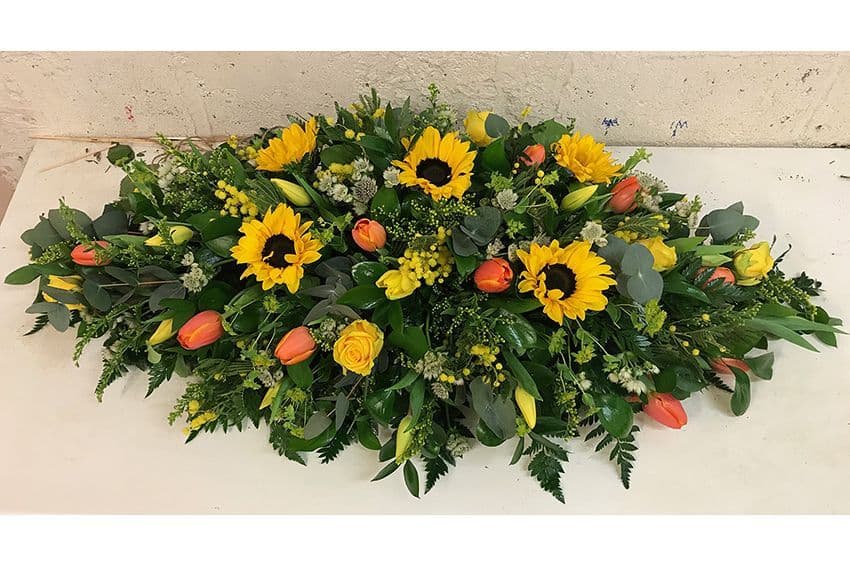 A Country Style coffin spray comprising a lovely mixture of flowers with foliage The spray is available in different lengths, 1m, 1.5m or 2metres long.
